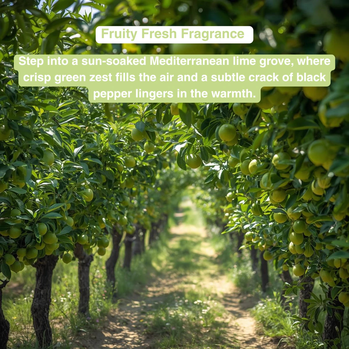 - Fruity Fresh Scent. Capturing the brightness of sunlit Mediterranean lime groves and the warmth of air on skin, this unisex fragrance blends sharp green lime with a subtle crack of black pepper — creating a crisp, energising scent that feels vibrant, refreshing and effortlessly clean.