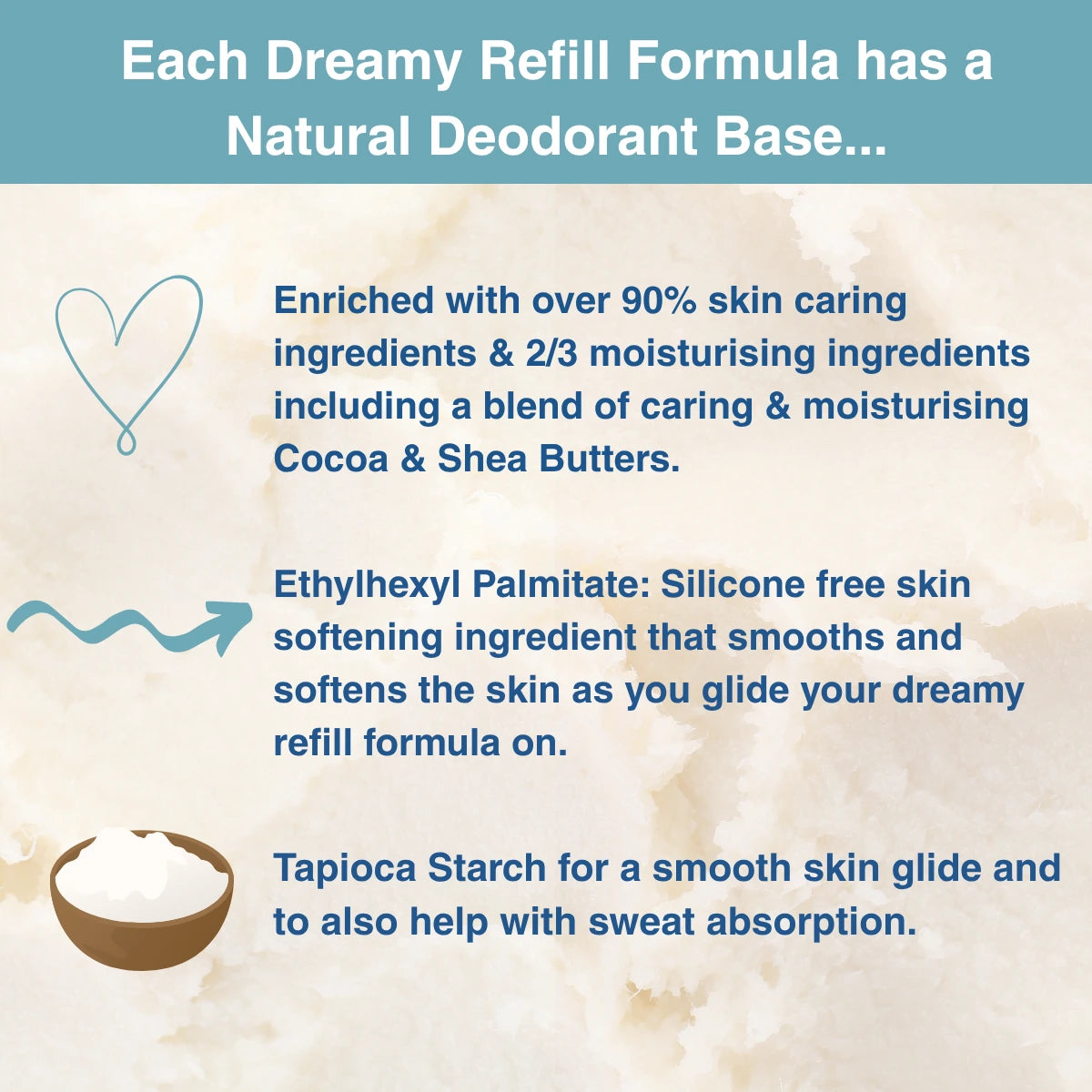 - A natural deodorant base with over 90% skin caring ingredients & 2/3 moisturising ingredients including a blend of caring & moisturising Cocoa & Shea butter’s.