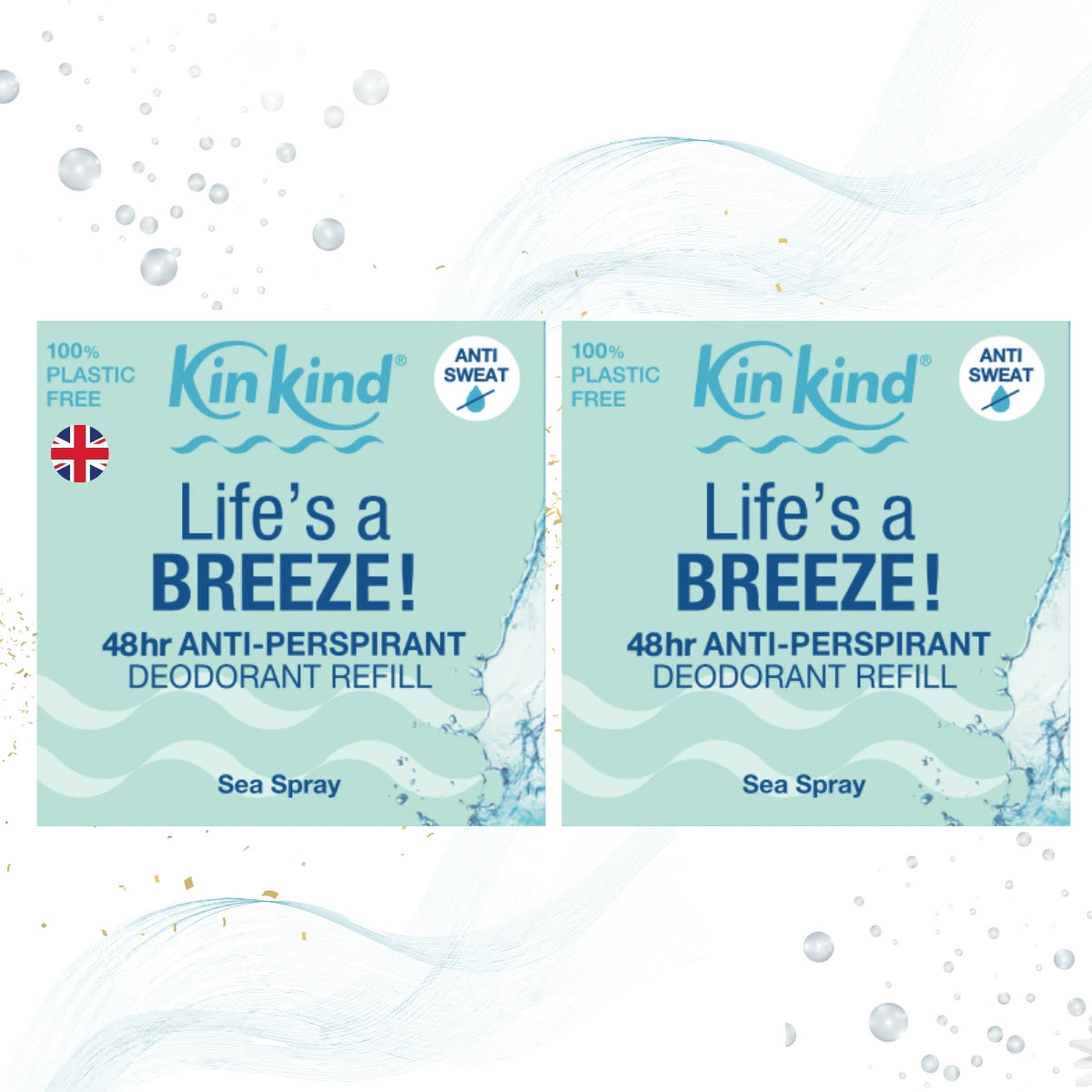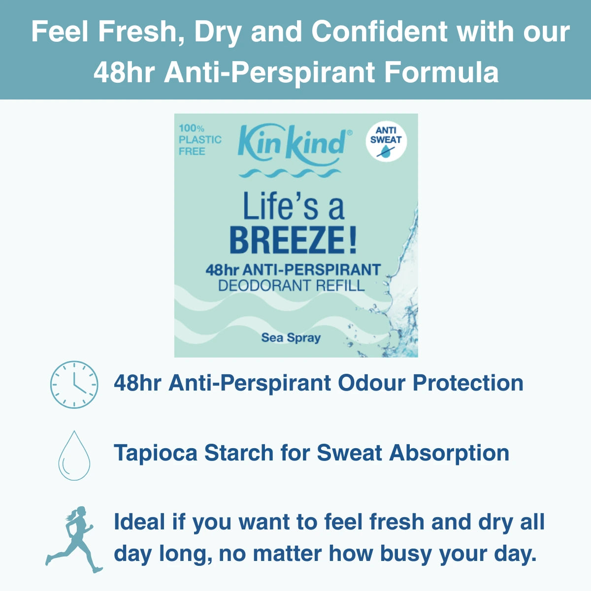 Begin enjoying the BETTER way to 48hr Protection with this sea spray unisex KinKind plastic free antiperspirant refill.
