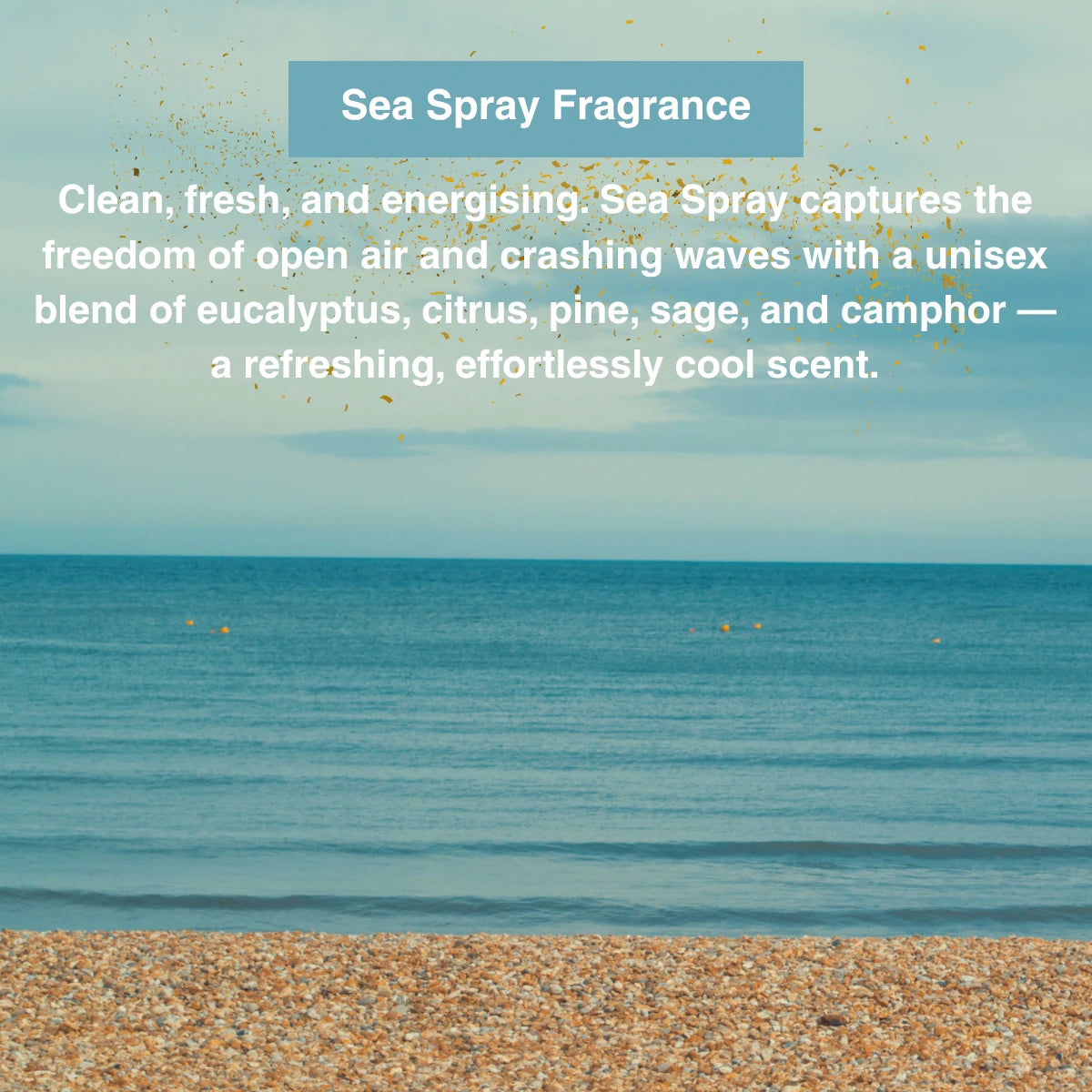 - Sea Spray Scent:Clean. Fresh. Energising. Our Sea Spray scent brings the freedom of open air and crashing waves into your everyday routine. This unisex scent combines invigorating eucalyptus and bright citrus with grounding notes of pine, sage, and camphor — creating a balanced fragrance that’s both refreshing and effortlessly cool.