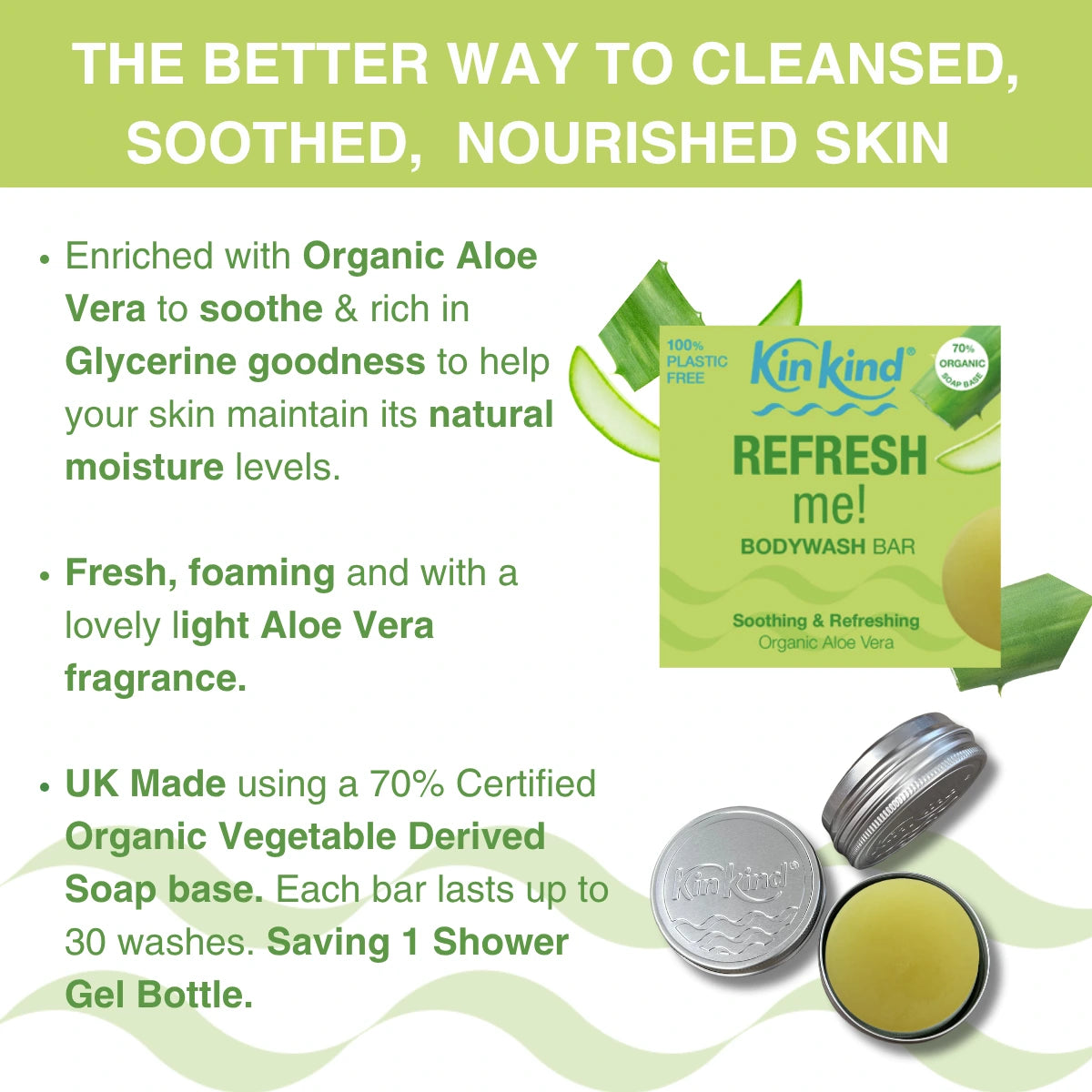 - REFRESH me! Aloe Vera enriched BodyWash bar: The perfect soothing complement to our haircare bars, this organic aloe vera enriched body wash bar refreshes and soothes while gently cleansing your body. Plus, it has a lovely fresh and light aloe vera fragrance.